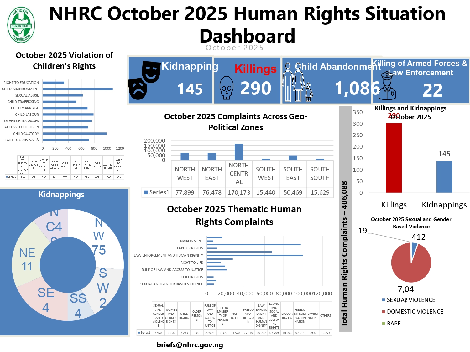NHRC Releases October 2025 Human Rights Situation Dashboard The National Human Rights Commission (NHRC) presents the October 2025 edition of its Human Rights Situation Dashboard, providing a comprehensive overview of complaints received by the Commission and human rights violations reported across Nigeria.