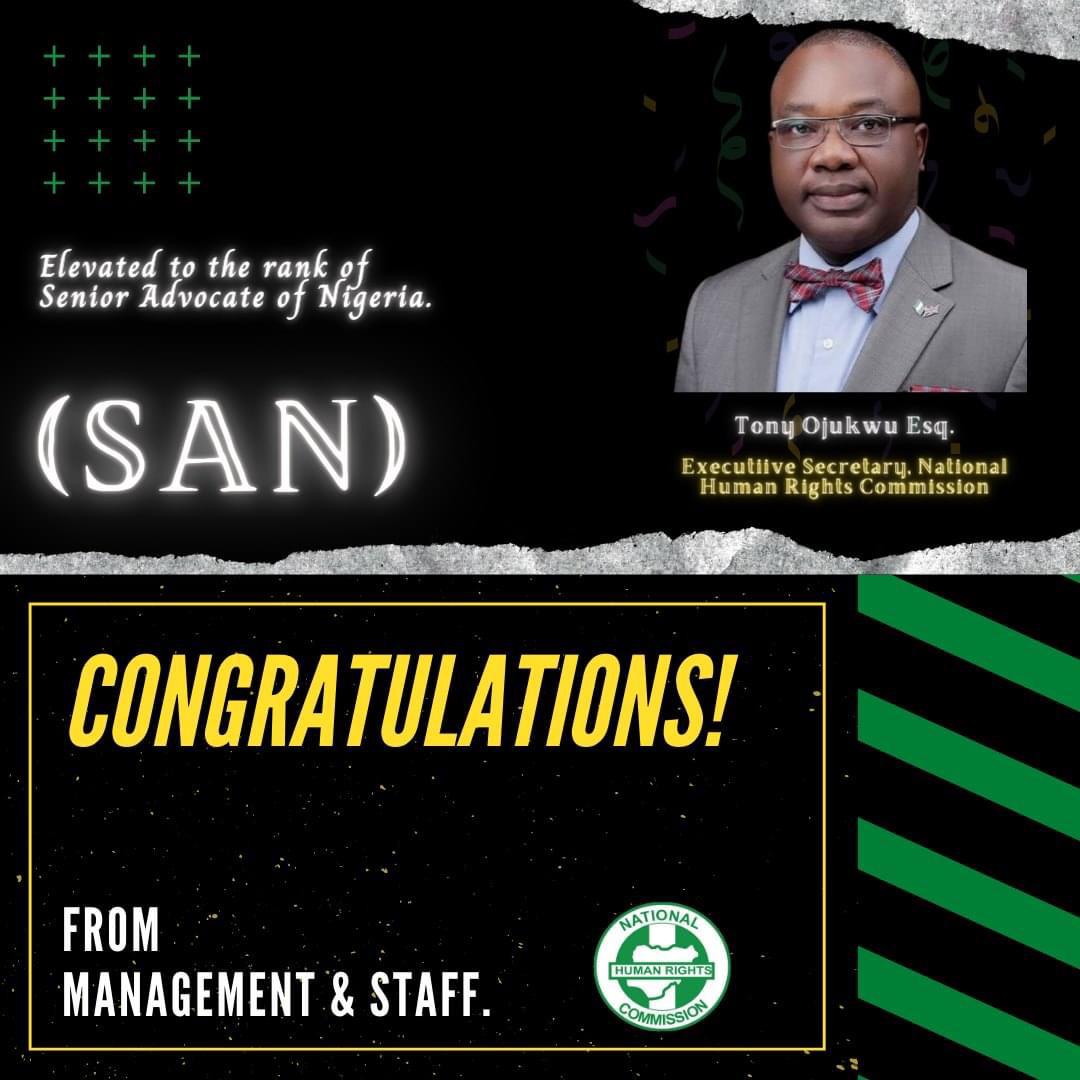 The Executive Secretary (ES) of the National Human Rights Commission (NHRC), Mr. Tony Ojukwu Esq, has been designated to be conferred with the prestigious rank of Senior Advocate of Nigeria (SAN) by the Legal Practitioners Privileges Committee (LPPC) at its 149th Plenary Session which held on the 21st October 2021.