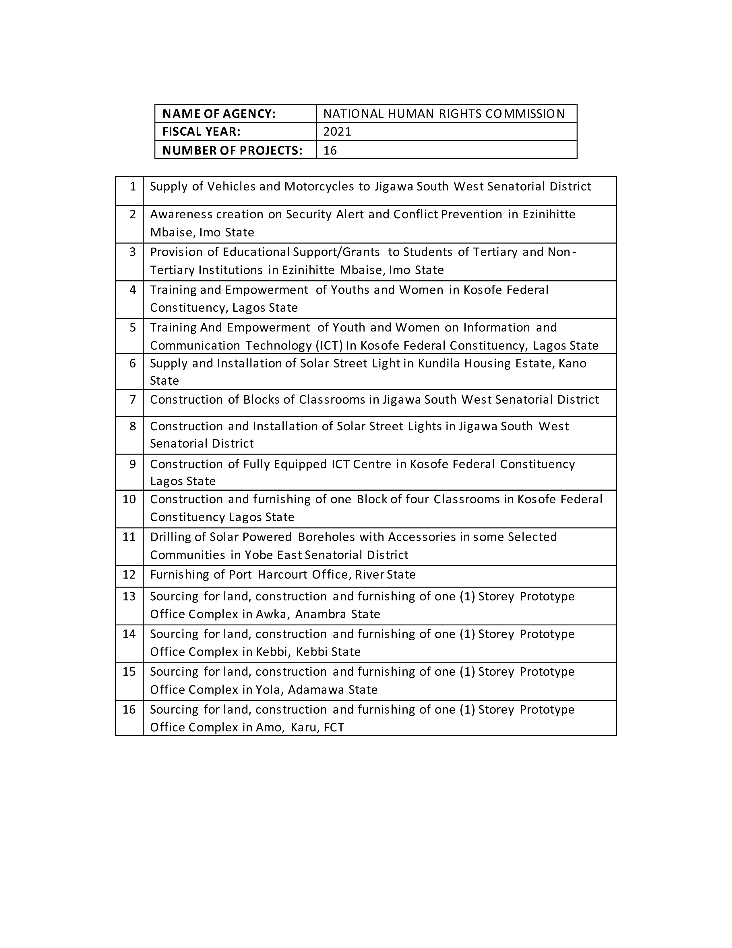 NATIONAL HUMAN RIGHTS COMMISSION LIST OF 2021 PROJECTS Below is the List of 2021 Projects for National Human Rights Commission Click here for the downloadable version.